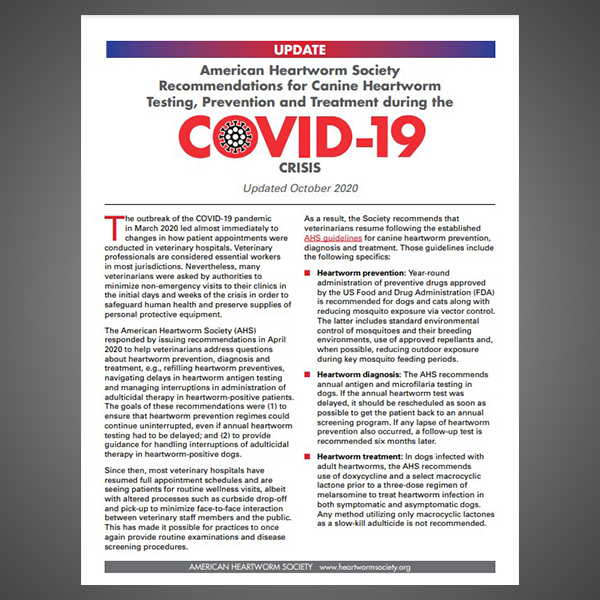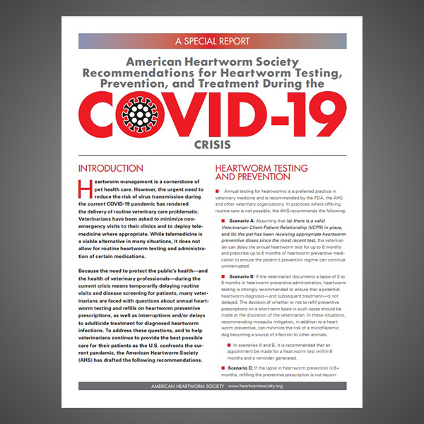 Updated guidance on returning to normal protocols for heartworm prevention, testing, and treatment as COVID-19 mitigation measures were relaxed.